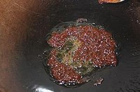 将茄条全部炸好后将锅里的油倒出去,锅里还会有些油,将或关小放入甜面酱,边搅边炒到甜面酱的香味爆出