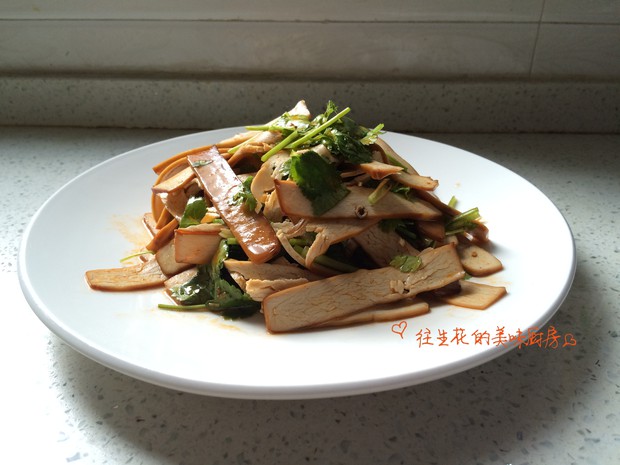 豆干切薄片,用开水略煮。(豆干质地较硬而韧,牙口好的可以不煮直接拌)