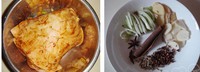 剔除肘子中的骨头,用手把肘子上抹一层黄酱,里面包上两瓣大料、几粒花椒、小茴香、葱、姜、里外抹黄酱,腌一夜