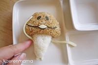 海苔剪成2个椭圆形,做蘑菇的眼睛,再剪出1个波浪大W型和开口较大的U型,组合起来做蘑菇的嘴巴,要记得剪成符合饭团的大小