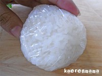 首先将用盐调味的米饭包保鲜膜捏成如图圆三角形的饭团,这一步不要捏的很实