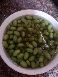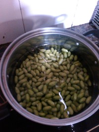把毛豆米洗净,放锅中用水煮涨,水开了建议把火弄小一点,因为豆子会产生很多气泡,火大了就溢出来了。