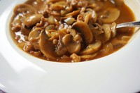 蘑菇用水煮熟切片备用,肉切丝放生粉搅拌均匀、洋葱切小丁。