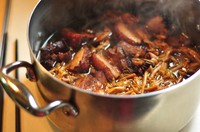 加入刚才的酱油里,加姜葱,八角,热水,煮至水开,转小火1小时。