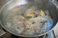 鸡肉切块后冲洗干净+姜片,冷水入锅,大火煮