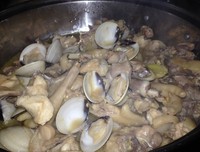 鸡翻炒至鸡肉刚开始变色后把白贝都倒进锅翻炒,把鸡肉和白贝尽量平铺锅面,避免堆一堆压着白贝不能开口。