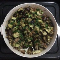 烤箱预热200度。茄子铺平整个盘子,上面放入炒好的肉沫,上面刷一层橄榄油。