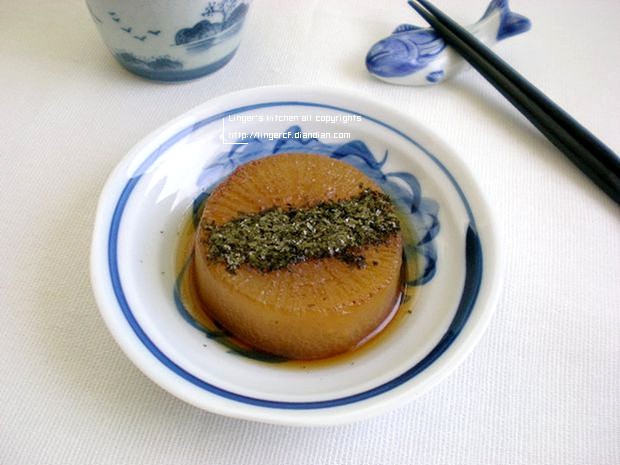 煮好的萝卜留在锅里自然冷却,使其充分入味;可以冷食,也可以在吃之前加热一下,并按个人喜好撒一些海苔粉。