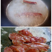 腊肠放开水里煮5分钟,捞起沥干切小片.