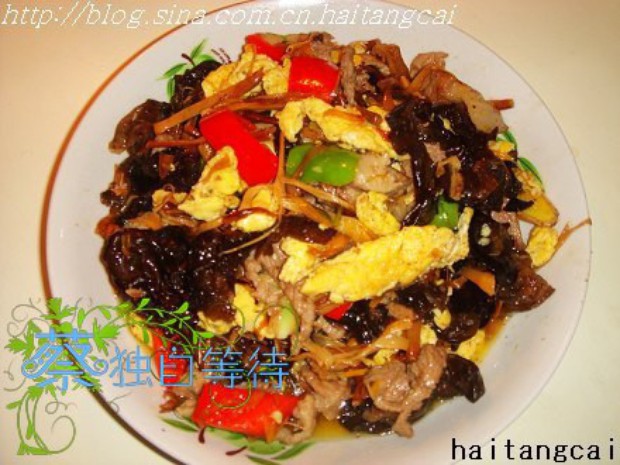 起热油锅将蒜,姜,两颗花椒,葱白,青红椒炒出香味,在依次放入黄花菜,木耳微炒,最后放入炒过的肉片和鸡蛋,放盐,用中火炒熟入味即可