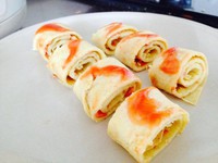 2. 两面焦黄之后起锅,卷好,涂上番茄酱,切开