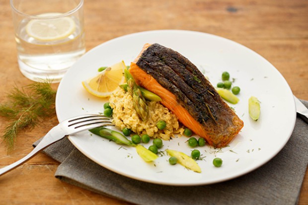 在微波炉中将盘子稍微加热至温热,在装盘前重新加热土豆泥。把土豆泥放在盘子中间,三文鱼放在土豆泥上面,把炒好的芦笋和青豆自然地洒在盘子上。挤一些柠檬汁在三文鱼上。