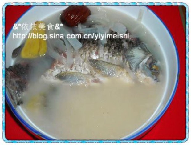 4. 把鱼转进烧开的滚水里,放入蜜枣,大火煲20分钟后转中小火再煲20分钟才加入萝卜丝;(如果你喜欢把萝卜切成块的话,就在装中小火的时候放萝卜块,同样美味)