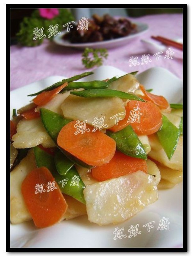 油锅烧微热后,先下胡萝卜,再下荷兰豆,最后是马蹄片,顺序不要错,调味料只要一大勺蚝油,一小勺盐就OK