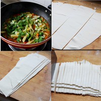 加入油菜加盖焖,再开始擀面,擀成薄片,切成宽片叠加切成细条