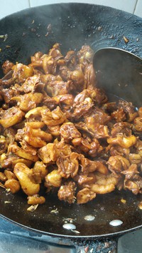 油烧热,放花椒,放鸡肉,然后大火炒,把水分炒干