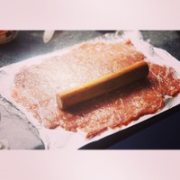 将锡纸提起,连同肉片一起放置在烤盘里,撕去保鲜膜;