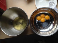 三、装蛋白的容器一定要洗净擦干,不要有水和油,否则会影响打发。模具最好是用阳极的,不要抹油撒粉垫油纸锡纸。难脱模、难洗模具,都是戚风的特性,戚风就是靠爬模具长高的。