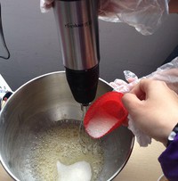 将牛奶(36g)、油(32g)、细砂糖(24g)、盐(1g)、香草精(1g)一起加入蛋黄中,用刮刀搅拌均匀(时间大概在5秒左右即可)如图。