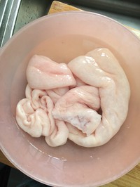 捞起的肥肠用凉水冲凉,切小段。这个切段忘拍了。