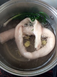 锅烧开水,放几片姜,一颗葱,倒几茶匙的料酒,把肥肠放下去煮10分钟,捞起。