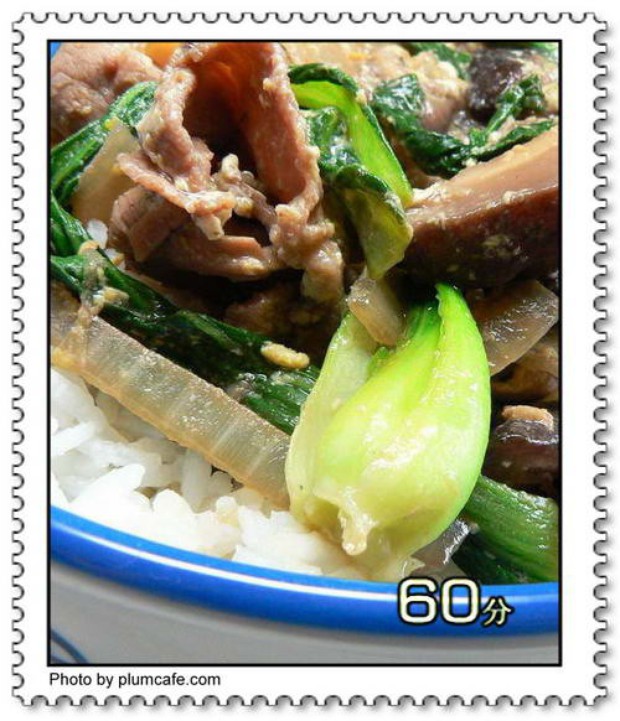 先把米饭煮上,然后准备其他的材料。因为比较讨厌切肉,所以我用的是买来的火锅用的猪肉片,不需自己来打理,只要准备其他的配料:鲜香菇6朵,切粗条,油菜3棵,逐片洗净并且把菜梗和菜叶分开,洋葱小半个切丝,鸡蛋一个,红酒(或者料酒也成)+酱油+1大匙糖调成一小碗的汁儿