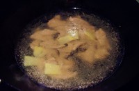 再取一干净锅,注入清水,放猪油(食用油)和姜片在里面烧至沸腾,沸腾以后加入盐、鸡精调味。