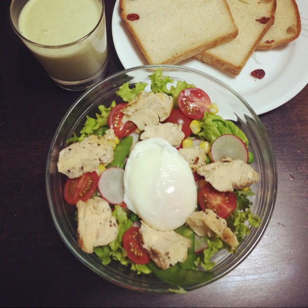 取一个玻璃碗,放入的顺序:生菜/莴苣/荷兰豆/萝卜/番茄/鸡胸肉/玉米和青豆。我还加了个水波蛋~