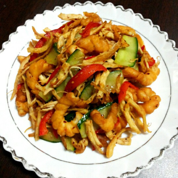 接着放入红椒片,黄瓜片,碎麻花一起炒拌,加少许盐调味,就可以出锅了