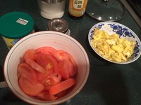 1. 鸡蛋炒好盛出备用,西红柿去皮切条