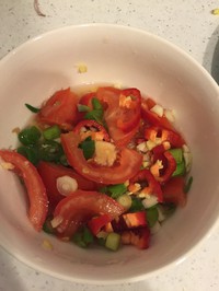 煮米粉和鸡肉的时候可以开始准备配料,姜蒜剁碎,辣椒切丁,西红柿切块,酸菜切块。