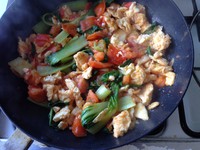 翻炒三分钟左右,放入小白菜,加少许生抽和油。