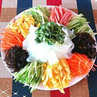 将事先调好的汁儿倒在上面,大家动筷时将其拌匀。