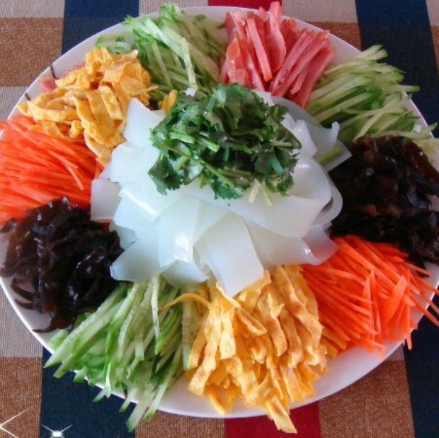 蛋饼也切丝,根据色彩将所有食材摆盘。