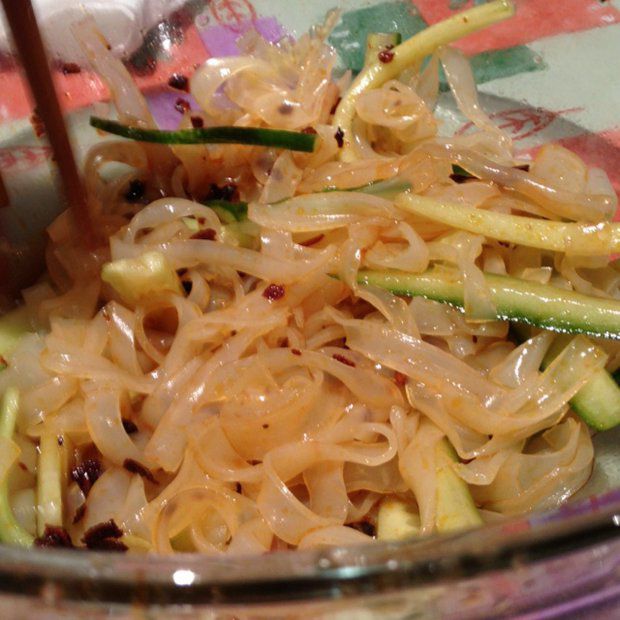 2. 粉皮熟透后滤起,晾凉待用,黄瓜切丝。