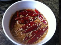 辣椒油做法:辣椒面放入碗中,菜油烧热,关火,油稍微冷一点,舀一点在辣椒面中
