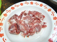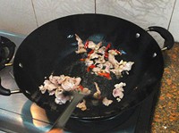 锅洗一下,热锅加油把瘦肉丢进去炒,断生加入红辣椒,翻炒几下