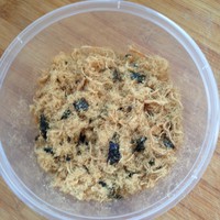 放入面包机,如果肉不够散,用一次和面程序,然后加入调料,用果酱程序,肉太湿的话果酱程序前20分钟重复一下,最后20分的时候加入芝麻、海苔碎。