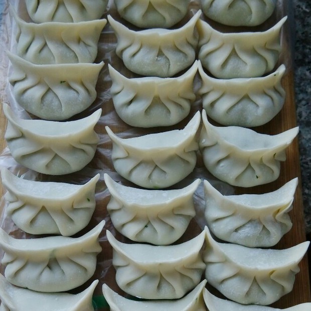 由于在外面买的饺子皮儿有点厚,包饺子的时候倒碗冷水,在饺子皮儿边上沾一沾水比较容易黏住,这样煮饺子的时候就不会进水
