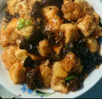 注:请耐心逐块炸制完成,小心油溅起。锅底留少量油,爆香葱蒜末(留少许葱花最后装饰),至微焦倒入调料汁,大火煮滚放入木耳、炸好的豆腐块,转中火煨3、4分钟(期间避免大力翻炒),入味收汁。