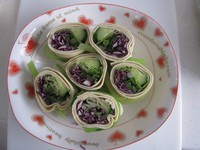 豆腐皮为了卫生可以先用热水烫一下,平铺好,把准备好的菜靠一边码好。