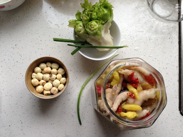 准备可密封玻璃瓶,1L-2L左右,倒入泡椒和糟卤,和处理好的鸡爪,可随意加入豆腐皮之类的。