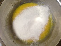 用电动打蛋器打发至粗泡后加入白砂糖,分3次加入。