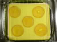 把面糊倒入铺有橙片的烤盘里。抹平表面,轻轻震几下,震出大气泡。放入预热好的烤箱,170℃20-25分钟。
