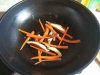 热油锅,放入少量盐炒熟胡萝卜丝和香茹