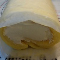淡奶油平铺蛋糕上,靠自己的这头厚些,越往对面越薄,到离对边3cm处结束,芒果粒在靠自己这头铺两条,轻轻提起油纸卷起蛋糕卷,边卷边撕掉油纸,直到卷好