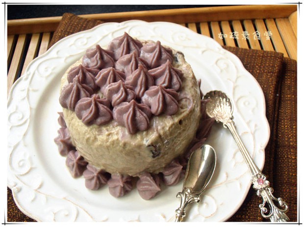 在冰淇淋入模冷冻后期,将紫薯、糖20g、腰果、香草精、一点水用料理机打细如牙膏状,填入自己喜欢的裱花嘴的裱花袋中稍速冻