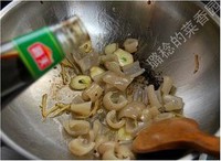 锅内再倒入一点油,油热后,先下姜丝、蒜片炒出香味,再下肉皮