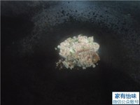 肉末变金黄后、把汁料倒进去,小火煮滚待用。
