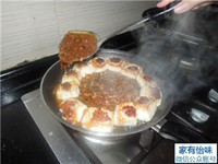煎完豆腐后,把煮好的汁均匀地放进平底锅中,使豆腐围着的中间和外圈都有汁。